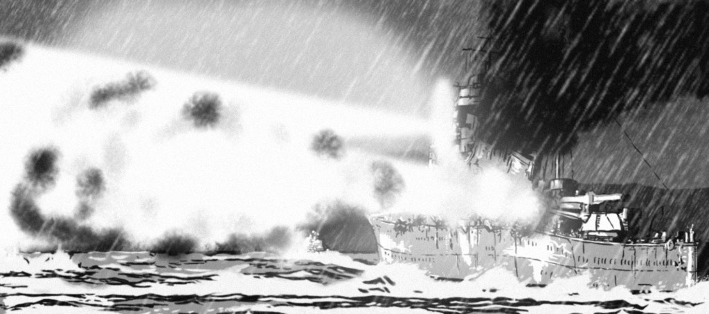 L’équipage de l’USS Chicago se met en alerte et le capitaine Bode est tiré de son profond sommeil, ce dernier ordonne de tirer des obus éclairants sur la colonne japonaise, mais les obus ne fonctionnent pas.