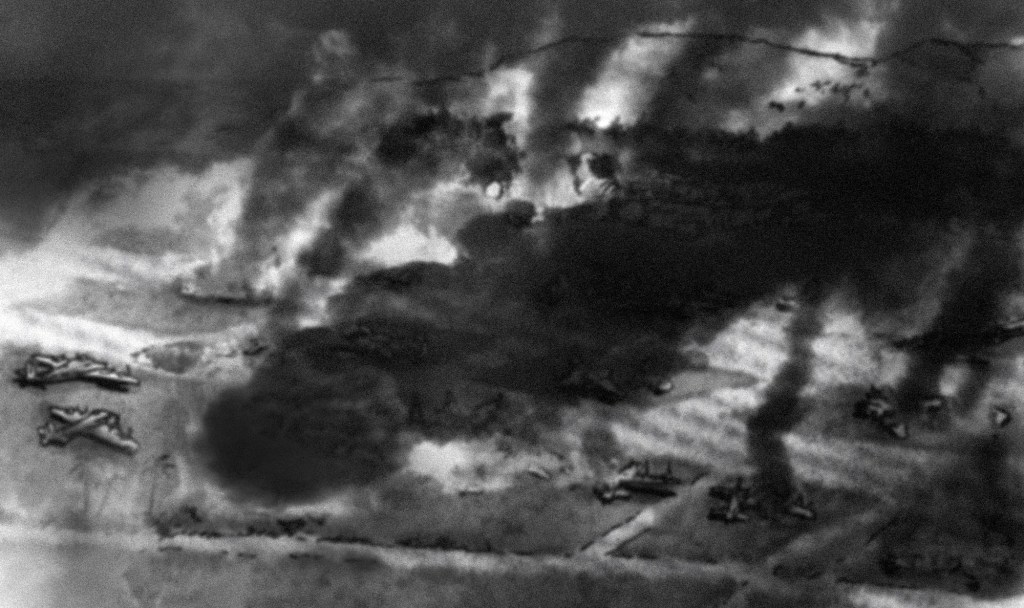 À 6 h 39 une partie des Reisen qui s’est dégagée de la chasse américaine fait une passe de mitraillages sur les positions américaines et s’attaque aux bombardiers américains survivants qui ont pris leur envol. À 6 h 51, les Reisen commencent à faire demi-tour et les derniers chasseurs américains renoncent à les poursuivre, car après de lourdes pertes ils ne sont pas assez nombreux. Ils parviennent à se poser tant bien que mal sur ce qui reste des pistes.