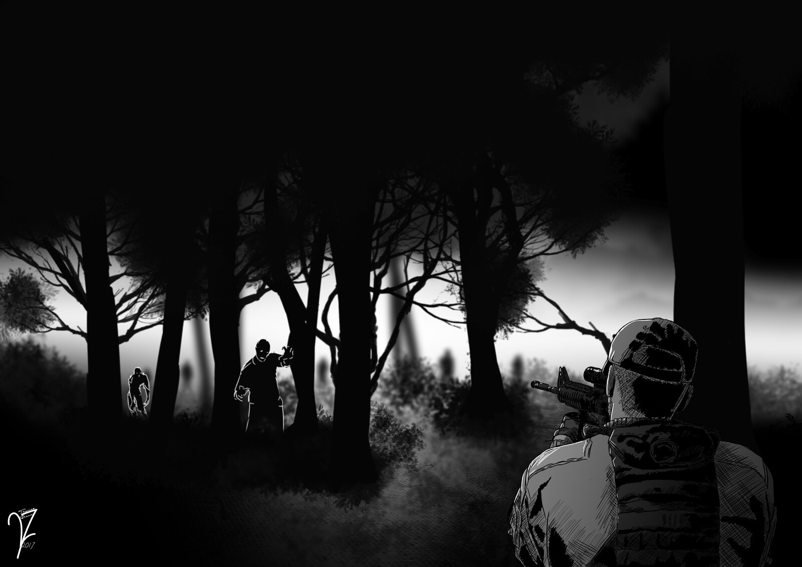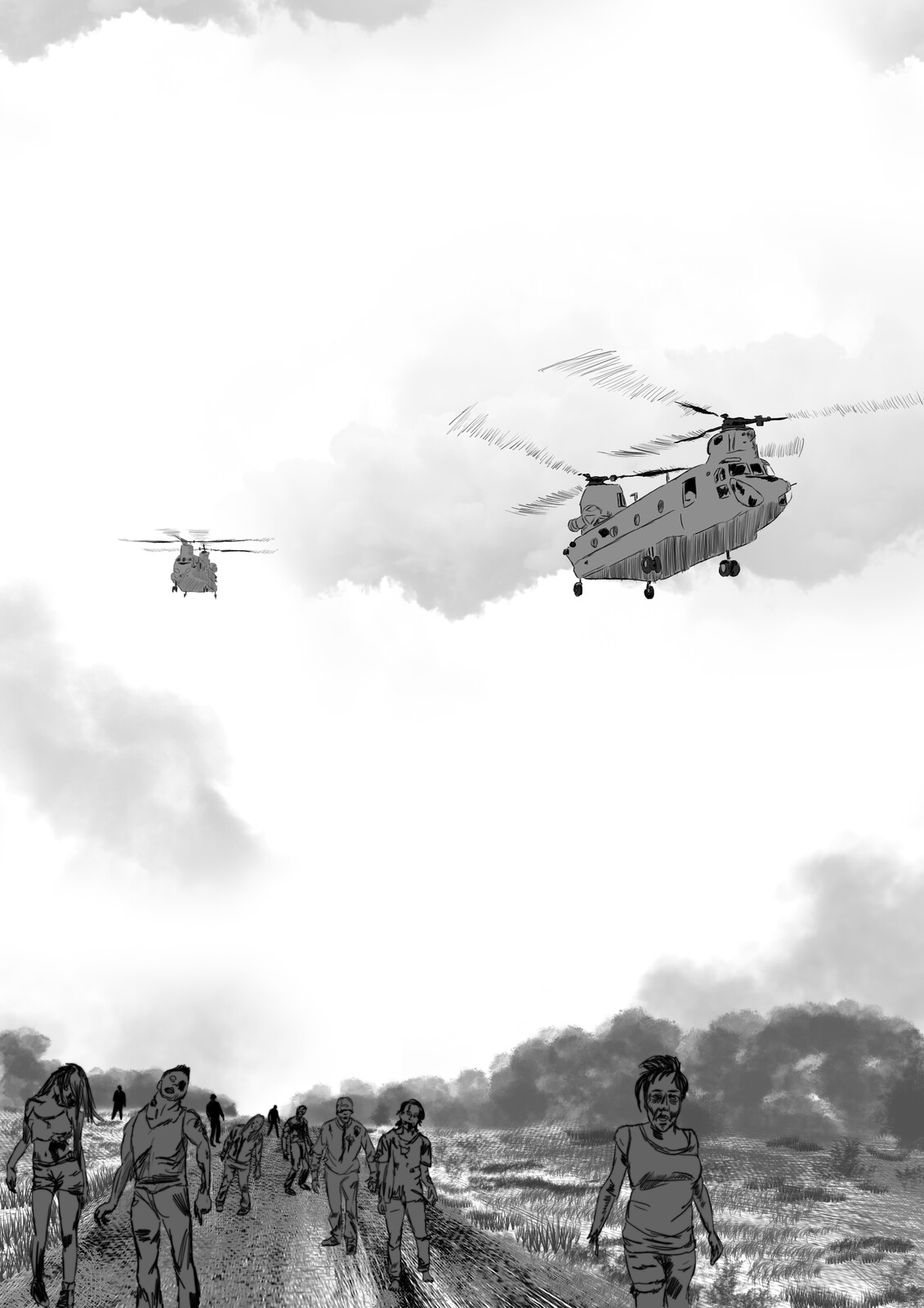 Un peu plus travaillée que les illustrations précédentes, mais tout de même fait en un temps très court. Probablement une heure. Les zombies sont progressivement attirés par le va-et-vient et des hélicoptères évacuant tous ceux qui peuvent encore l’être.