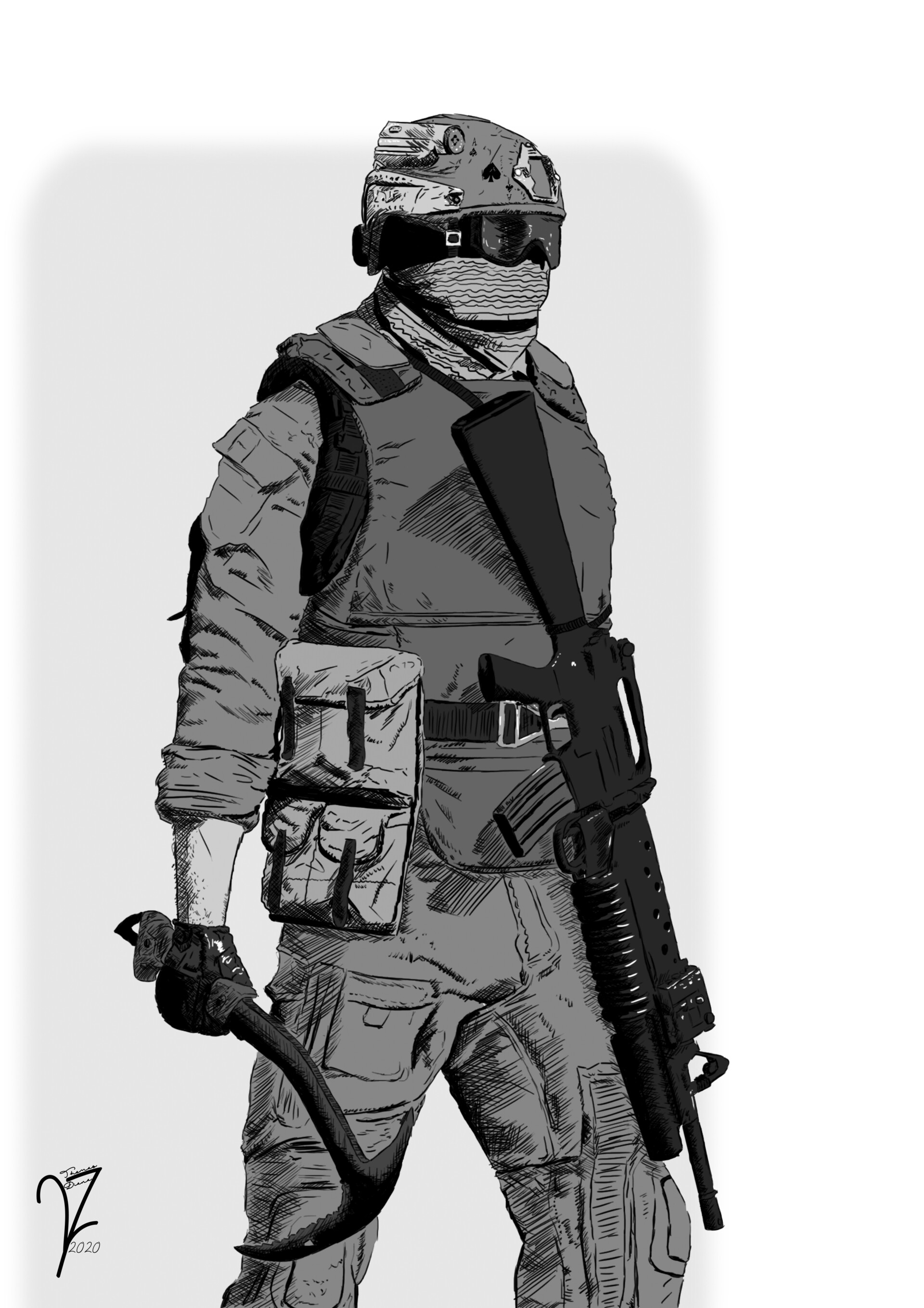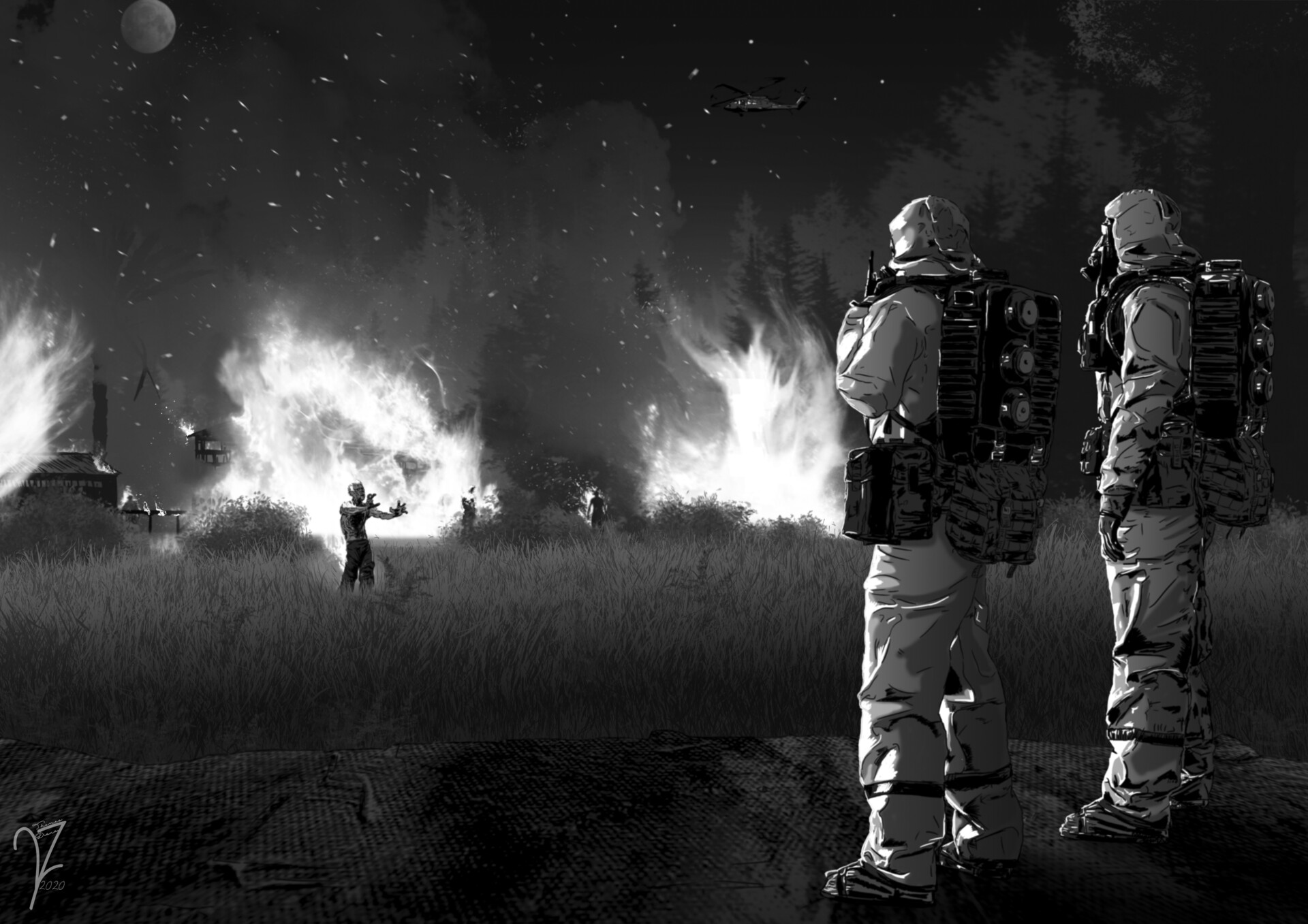 On retrouve la combinaison Hazmat aperçue dans l’illustration « Kill it ». Visiblement, ces soldats supervisent, en coordination avec un Black Hawk, le nettoyage d’une « village ». Un nettoyage par les flammes, ce qui n’est pas la meilleure idée, mais permet de faire une illustration plutôt spectaculaire.