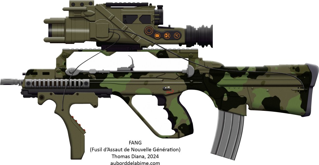 Le FANG (Fusil d’Assaut de Nouvelle Génération). J’ai des idées de nouveaux designs toutes les semaines, voire plus souvent que cela. Souvent, je les note dans un coin, parfois accompagné d’un premier brouillon. Mais de manière ponctuelle, j’ai besoin de m’en sortir de la tête en allant au bout du processus créatif. C’est le cas du FANG, car j’avais besoin de créer quelque chose la semaine dernière, mais je n’avais pas de créneau de travail assez long pour travailler sur « Au Bord de l’Abîme ».