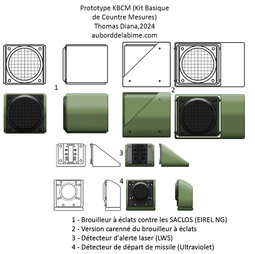 Il s’agit d’une vue d’artiste du bloc KBCM aperçue sur certains EBRC Jaguar. Il est monté sur la face avant de la tourelle à droite du canon de 40 mm. Sur l’EBRC Jaguar, le KBCM est associé au système de vision à 360° ANTARES (Thales), au Brouilleur Anti-IED Réactifs Actifs Goniométriques BARAGE (Thales), au détecteur acoustique de tir PILAR V (METRAVIB) et aux éternelles grenades GALIX (Lacroix).