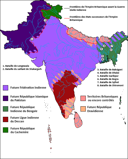 Ce qui était autrefois une composante importante de l’Empire britannique se retrouve alors divisé en huit pays : la Fédération des États princiers de l’Inde, la République Dravidienne, la République indienne du Bengale (nouveau nom de la République Indienne Libre), la République fédérale indienne, la République islamique du Pakistan, la République du Cachemire et le Royaume du Sikkim.